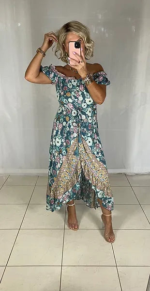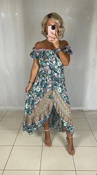 ABOUT OUR RAFFA OFF SHOULDER HI LO DRESS
