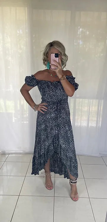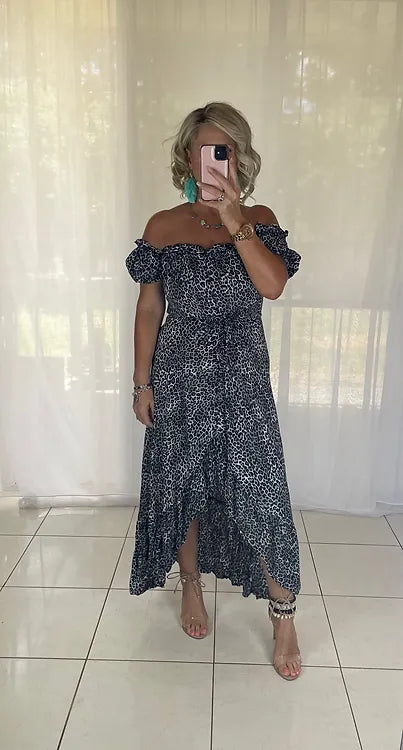 ABOUT OUR RAFFA OFF SHOULDER HI LO DRESS -